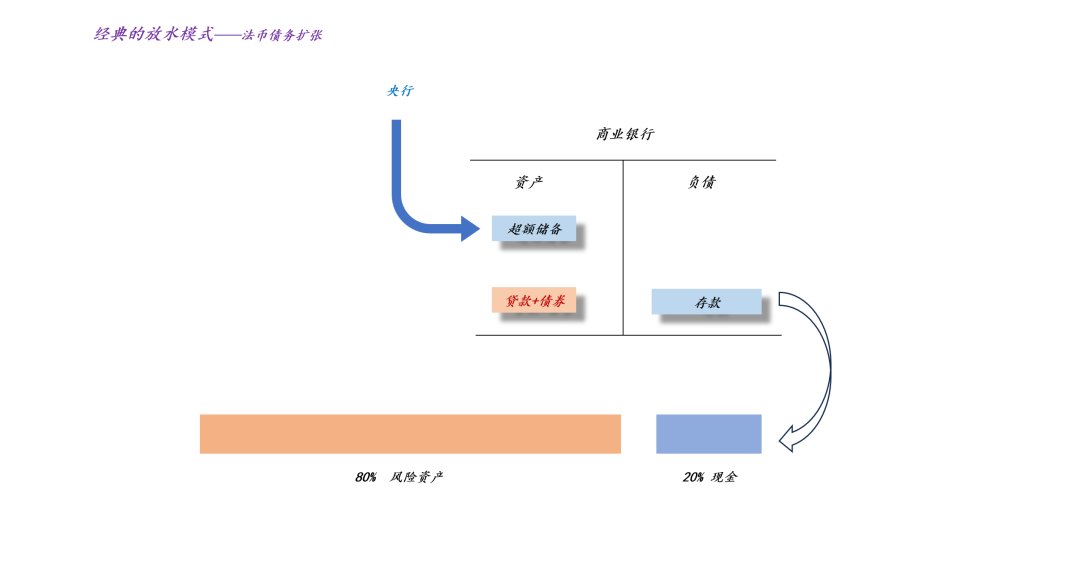 如上图所示,在这种体系下,一方面,央行扩张超额准备金;另一方面,商业银行扩张信用,贷款和债券等法币债务规模膨胀。最终,我们会观察到存款的扩张,以及风险资产价格的膨胀(ps:假设风险偏好维持不变,即居民意愿的现金/风险资产比率)。