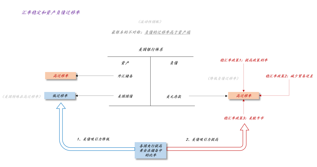 如上图所示,对于任意经济体而言,汇率问题的本质在于,负债端的迁移率高于资产端。具体来说就是,本币存款更容易转化成外币存款,但是,本币国债没那么高的跨境流动性,于是,该国不得不依赖外汇储备轧平差额。
