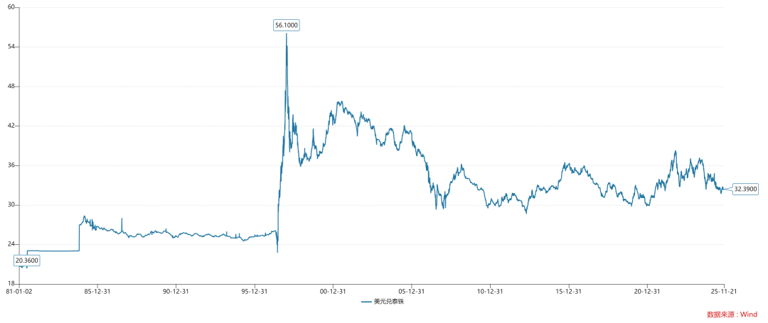 在极端情况下,资产负债两端的压力差会击穿了该国的外汇储备,于是,该国的货币会快速贬值。如上图所示,在亚洲金融危机期间,泰国的外汇储备就被击穿了,美元对泰铢的汇率快速攀升至一美元对56泰铢。