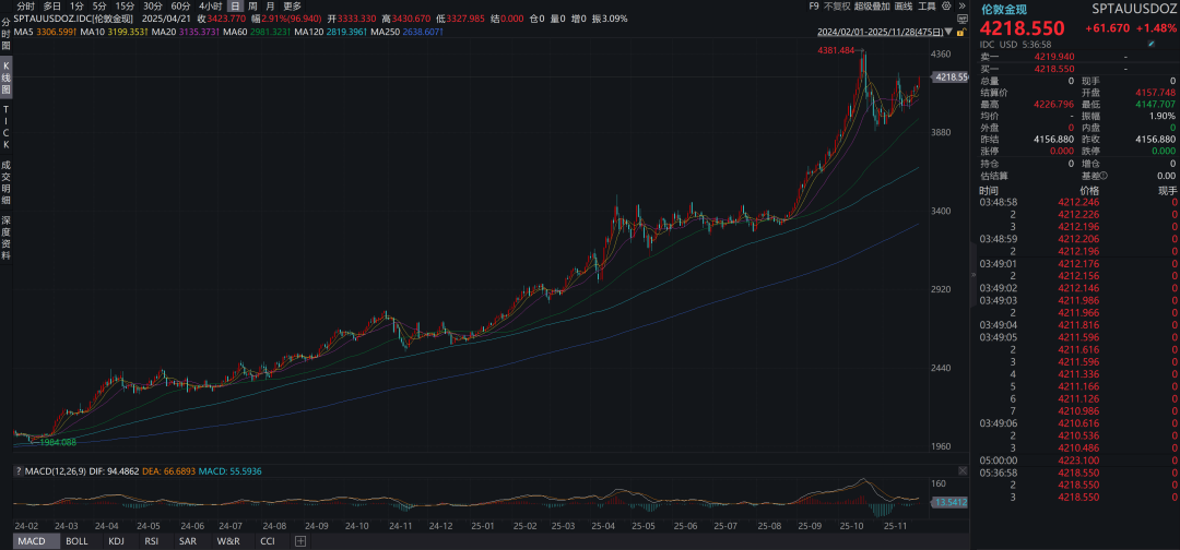 如上图所示,2024年初伦敦金现的价格为不到2000美元,现在已经飙升到了4200美元。