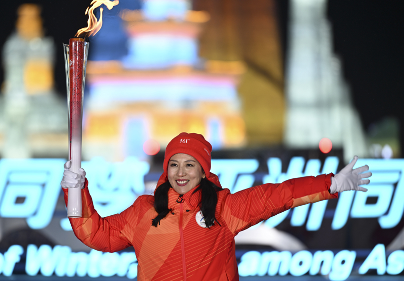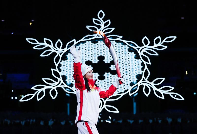 新华社照片,北京,2022年2月4日\n (北京冬奥会)(37)2月4日冬奥头图\n 2月4日晚,第二十四届冬季奥林匹克运动会开幕式在北京国家体育场举行。\n 这是火炬手杨扬在开幕式上传递火炬。\n 新华社记者 曹灿 摄